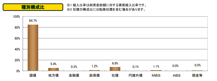 日本の公社債で構成されていますが、政府が発行する国債が80%以上を占めることが分かります。