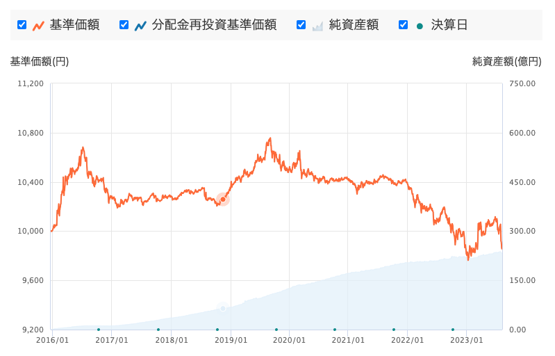 ここ数年の基準価格は下落傾向ですが、為替の影響を受けない国内資産ということもあり値動きは安定しています。