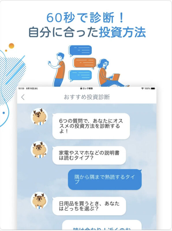 自分にピッタリの投資方法をチャット形式で約60秒スピード診断してくれます。