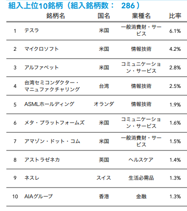 組み入れ上位10社は以下のとおりです(2022年7月末現在)。