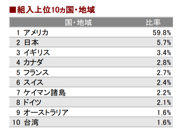 組み入れ上位国、地域を見てみると、米国が最も多く次いで日本、イギリスとなっております。