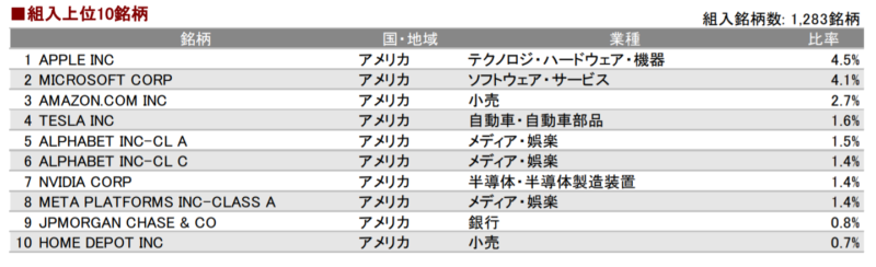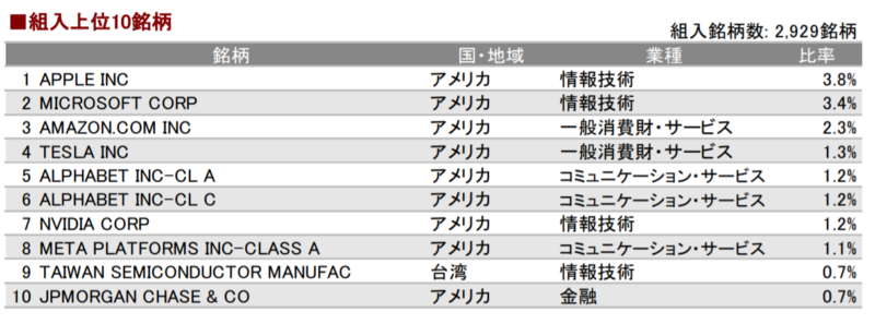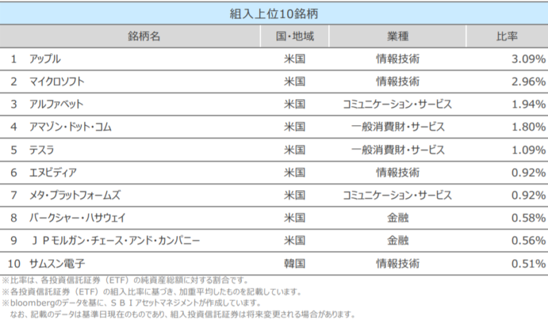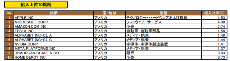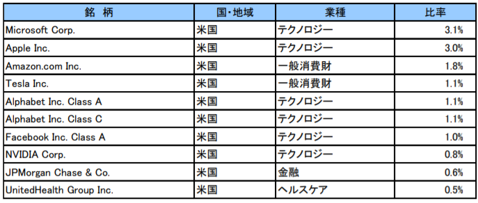 組み入れ銘柄に関しては、やはりAppleやMicrosoft、Amazonなどの米国企業が上位に。