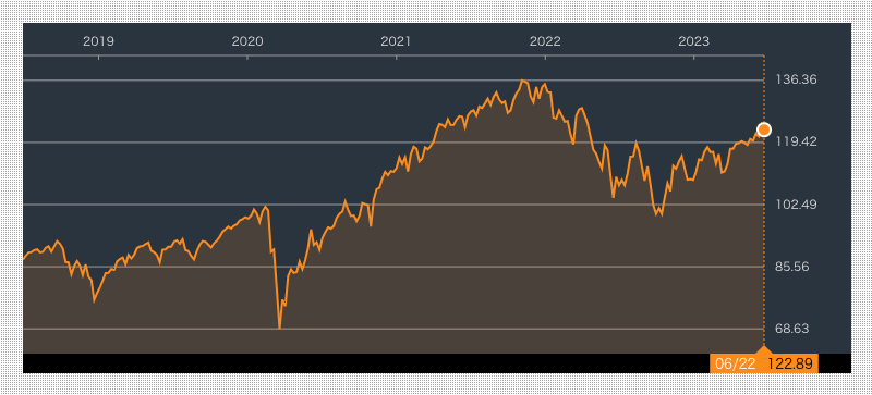 以下のチャートは、約49か国の先進国・新興国、約9287銘柄で構成されているETF「 バンガード・トータル・ワールド・ストック・ETF(VT)」の過去5年のチャートです。