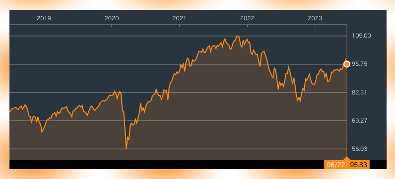 コロナショックの際に大きな下落局面があったものの、その後は回復し、2023年6月現在でほぼ120ドルを突破しています。