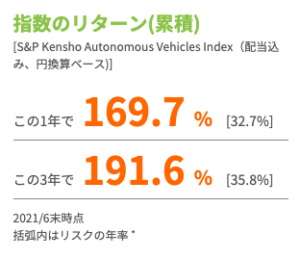 自動運転という特定のテーマに投資をすることになるので、そのテーマのブームが去った場合は他のインデックスに比べて投資成績が悪くなる可能性があります。