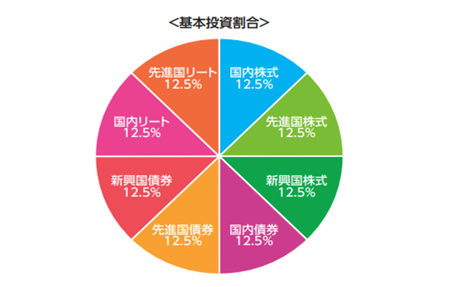 名前からもわかる通り、この投資信託は、以下のチャートのように国内株式・先進国株式・新興国株式・国内債券・先進国債券・新興国債券・国内リート・先進国リートと、8種類の資産へそれぞれ12.5%ずつ投資しています。