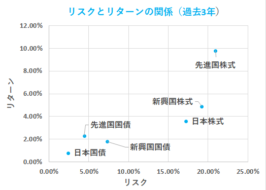 日本はマイナス金利に突入して久しいですが、リターンはそれほど期待できませんが、値動き(=リスク)が低いので安定した運用ができます。