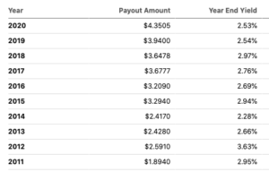 2020年の分配金は4.35ドルとなっていて、前年の3.94ドルから10%以上の増配となっています。