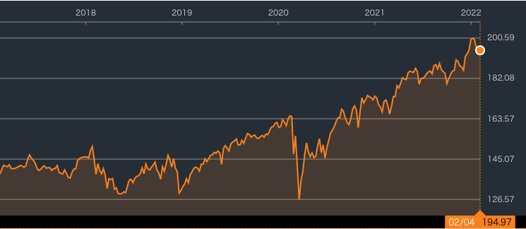 過去5年のリターンをS&P500と比較したのが以下のチャートです(2022年2月5日現在)。