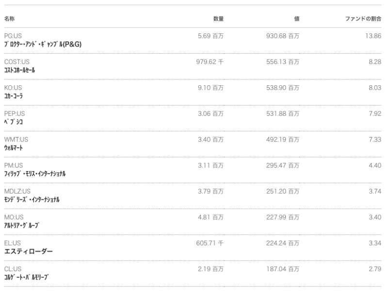 ウォルマート、アルトリア、P&G、コカ・コーラなどの企業で構成されるMSCI US Investable Market Consumer Staples 25/50 indexに連動します。