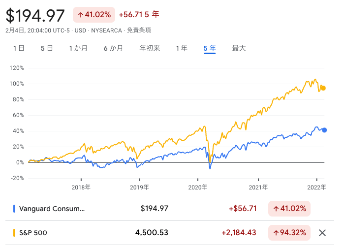 一方、2020年2月のコロナショック時における株価の下落幅は金融銘柄や景気敏感株を多く含むS&P500よりも小さいですね。業績の安定している銘柄で構成されているVDCは、S&P500に比べて株価の値動きがマイルドです。