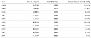 2020年の分配金は2.71前年の3.62ドルから減配となっています。