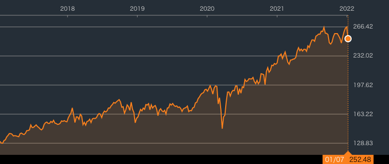 さすがに2020年2月のコロナショックの際には短期間で大きく株価は下落しましたが、既に暴落前水準を回復し、過去最高値を更新し続けています。