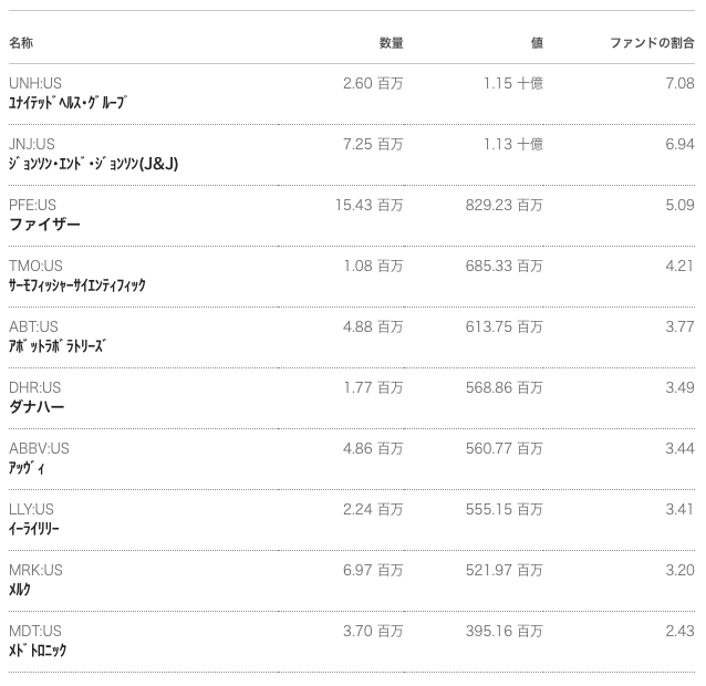 ジョンソン・エンド・ジョンソン、ファイザー 、メルくなどの医薬品企業などで構成されるMSCI USインベスタブル・マーケット・ヘルスケア・インデックスに連動します。