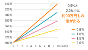 例えば、500万円を10年間運用し年率3%の収益が得られたとした場合、コストの違いによって、