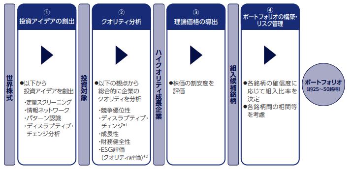 成長性や競争優位性、財務健全性などのクオリティ評価を行い、株価の割安度を評価した上で投資先を選定するアクティブ型の投信です。25〜50銘柄で構成されます。