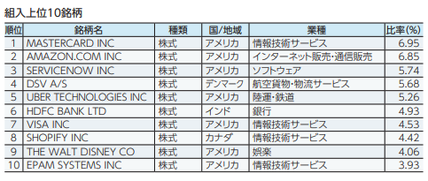アマゾンやマスターカード、ウォルト・ディズニー、アドビなどもあり、米国の大型企業が上位銘柄を占めています。