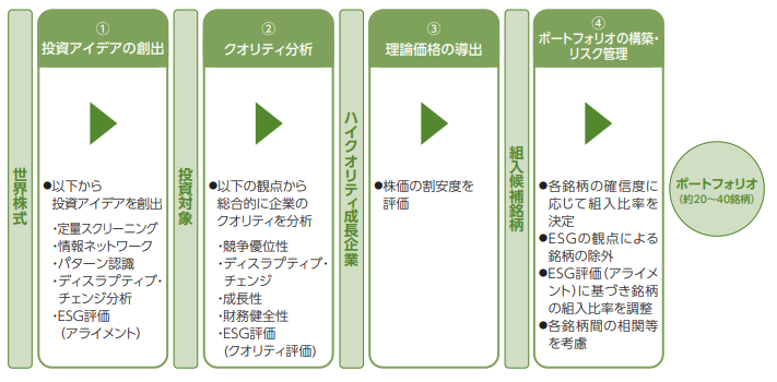 また、ハイクオリティ成長企業は投資アイデアの分析・評価をはじめ、個別企業の競争優位性や成長力を評価したうえで、質が高いと判断された企業を指します。
