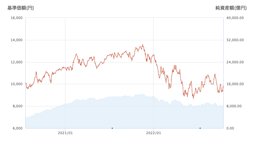 一方、22年に入って世界的な金融引き締めの影響で株価は下落傾向ということもあり、基準価格は大きく下落しています。