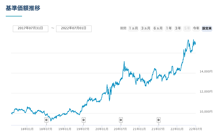 コロナショックのあった2020年2月に、ほんの一瞬だけ基準価格が下落するタイミングがありましたが、それ以降はすぐに基準価格が回復しています。