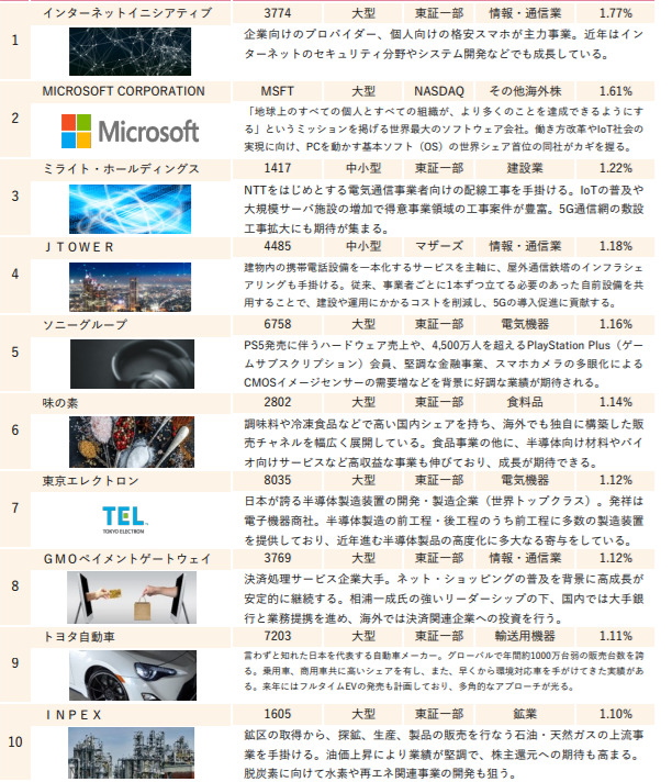 しかし、構成比率の高い銘柄を見ると、マイクロソフトやソニーグループなどの大企業も多く含まれていることがわかります。