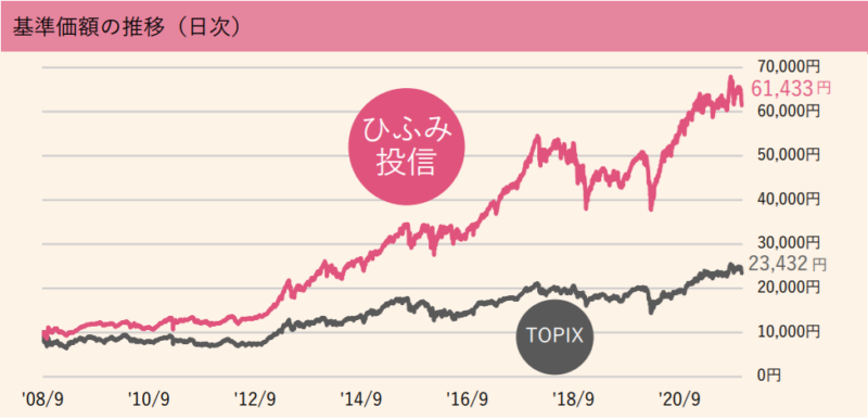 ここ数年、TOPIXの基準価格は変わらない中、ひふみ投信の基準価格は設定時から約6倍にも伸びています。