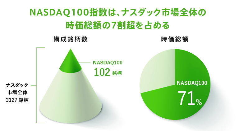 このNASDAQ100指数は、構成銘柄数は少ないものの、ナスダック市場全体の時価総額の7割超を占めているんですね。