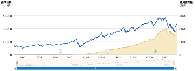 一方、22年に入ってロシアのウクライナ侵攻もあり株式市場は調整局面に入っていて、基準価格が大きく下落しています。