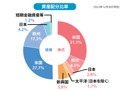 米国、欧州、日本、新興国などの株式や債券で構成される上記の投資信託を組み合わせて投資することで、世界の時価総額の比率になるように分散投資が行われています。