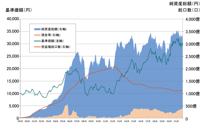 また、基準価格は右肩上がりでも、口数が減少し続けている点にも懸念があります。