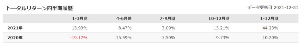 コロナショック後は驚異的な上昇を記録し、2021年のトータルリターンはなんと44.23%を誇ります!
