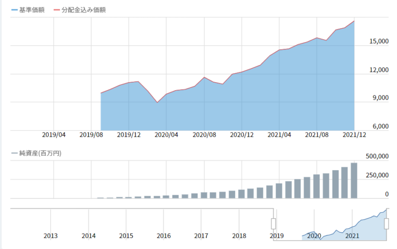 その後は基準価額・純資産額ともに右肩上がりで伸びています。