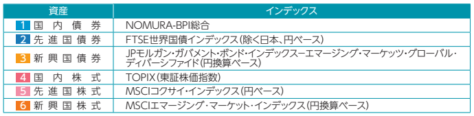 ラインアップは標準タイプ、株式シフト、債券シフトの3種類から構成され、国内、先進国と新興国、債券と株式の合計6つのインデックスで構成されているのです。