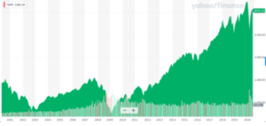 それは過去のパフォーマンスを見ると理由は明らかですね。以下が過去20年間のS&P500のチャートです。