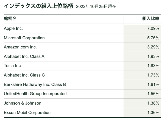 ちなみに構成銘柄を見ると、S&P500は時価総額の大きい銘柄の比率が高くなるため、現在勢いのあるMicrosoftやApple、Alphabetなどのハイテク企業が上位を占めているのがわかります。