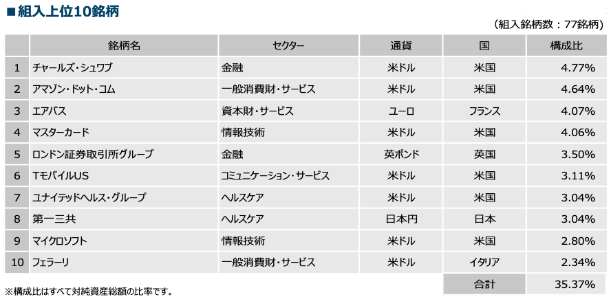 米国企業のアマゾンやマスターカード、イタリアのフェラーリ、日本企業だと医薬品の第一三共が上位に組み入れられています。