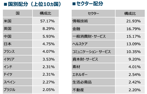 ちなみに国別の配分やセクター配分は以下のとおりとなっていて、米国企業が約6割を占めています。