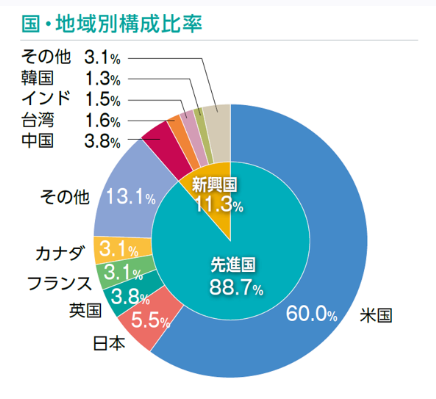 組入銘柄数は約3000の株式100%となっています。上位10銘柄を見ると、ほとんどが米国企業となっていて、好調な米国市場を牽引している巨大ハイテク企業が上位を占めているんですね。