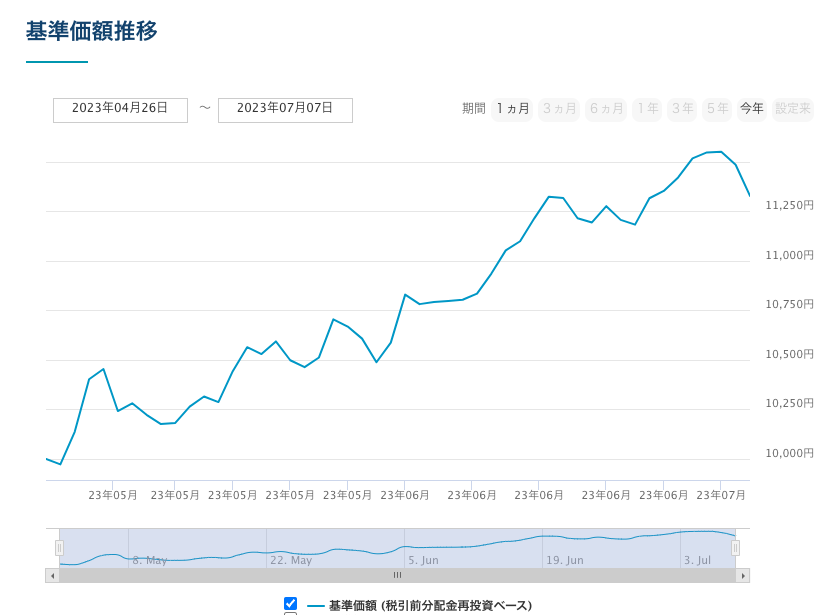 2023年に入ってハイテク株を中心に株価が大きく上昇していることもあり、Tracersオールカントリーの基準価格も短期的に上昇中です。