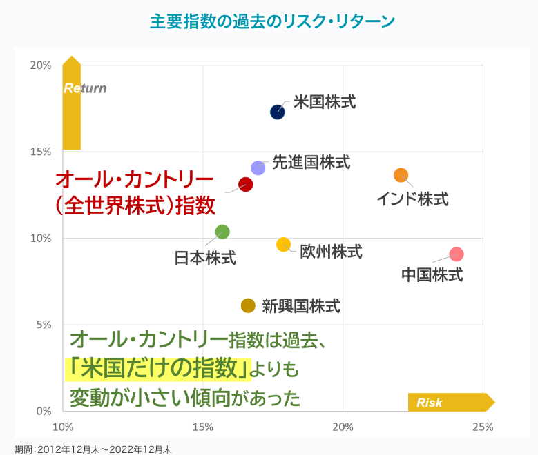 以下の図は、主要指数の過去のリスク・リターン(2012年12月末〜2022年12月末)です。